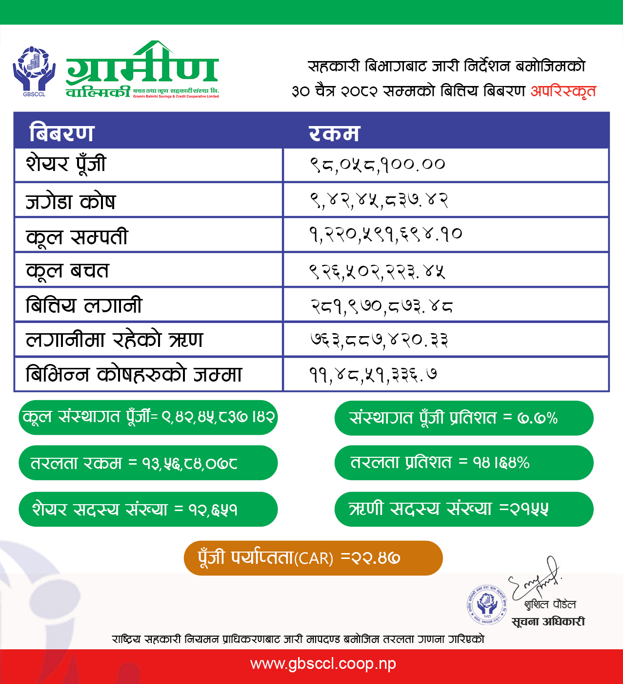 संस्थाको आर्थिक तथा अन्य गतिविधिहरुको सूचना एवं जानकारीहरु सदस्यसमक्ष प्रविधिको प्रयोग मार्फत समयसापेक्ष सरल र सहज रुपमा उपलब्ध गराउने उद्देश्यका साथ विकास गरिएको यस वेवसाईटमा यहांहरुबाट रचनात्मक सल्लाह तथा सुझावहरु प्राप्त हुने अपेक्षा गर्दै संस्थागत विकासमा ऐस्यवद्धता प्रकट गरिदिनुहुन सम्पूर्ण सदस्य तथा शुभचिन्तक महानुभावहरुमा हार्दिक अनुरोध गर्दछौं ।